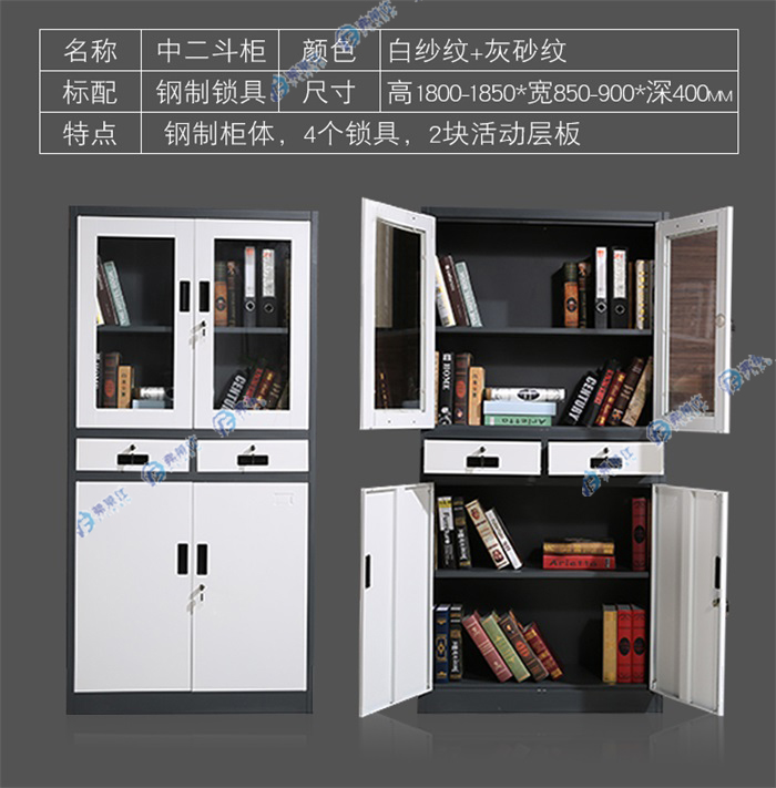 顏色:白紗紋+灰紗紋 規(guī)格:高1800-1850*寬850-900*深400mm 用途:鋼制柜體,4個(gè)鎖具,2塊活動(dòng)層板,廣泛適用于各種場所。